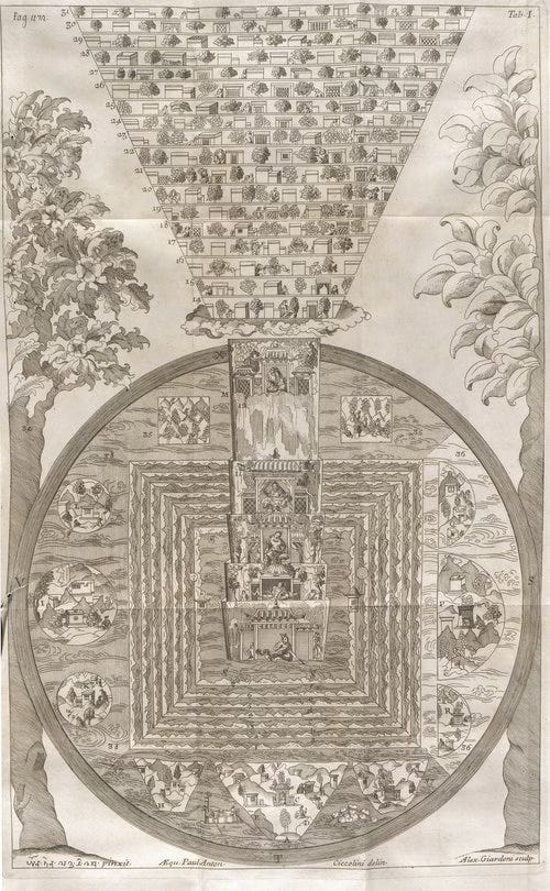 The “Figura mundi” first appeared in a book called Alphabetum Tibetanum, published in Rome in 1782. The author was Antonio Agostino Giorgi (1711-1797), an Italian friar of the Order of Saint Augustine.